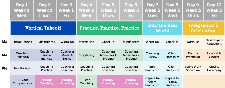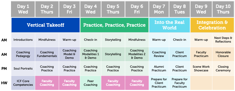Each day’s activities are thoughtfully paced between short lectures, group discussions, experiential activities, breakout coaching sessions and more - all designed to build coaching skills, transform leadership, and develop a community of trust.